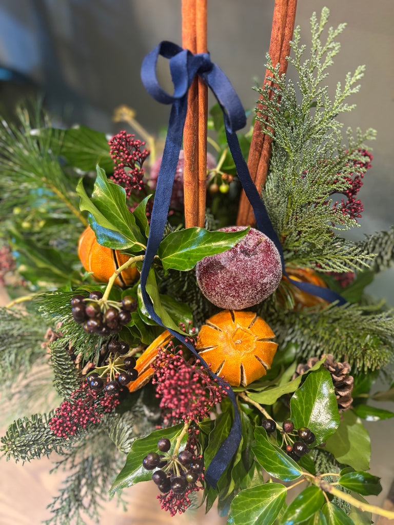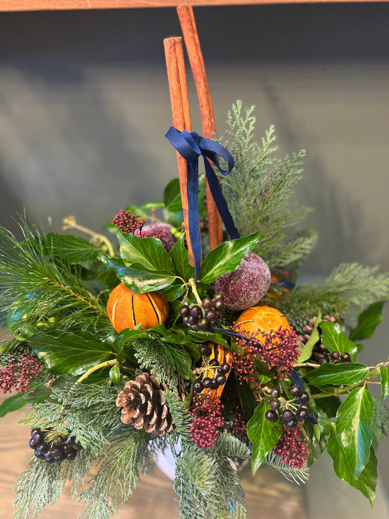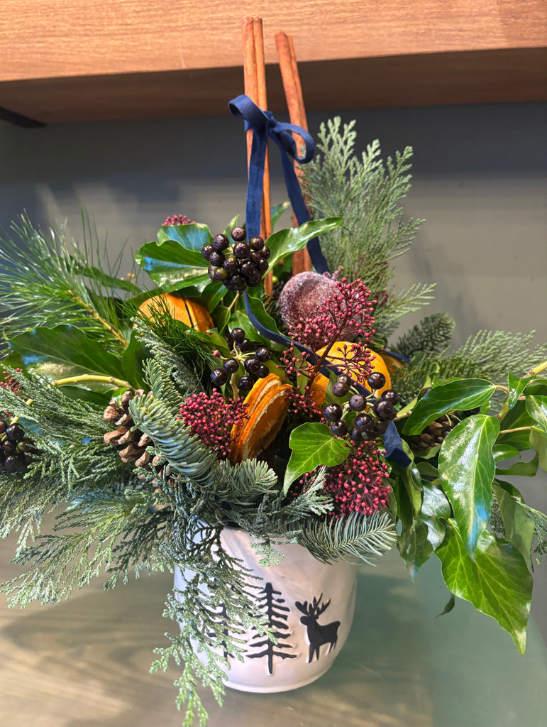 This charming arrangement blends fresh Spruce, scented Eucalyptus,and Berry Ivy with Skimmia, Cinnamon sticks and soft Velvet ribbon.Frosted apples, Pine cones and dried fruits add seasonal warmth creating a beautiful fragrant display that feels truly enchanting. Please note:due to seasonal demand,Foliage,ribbon or ceramic may vary ...
