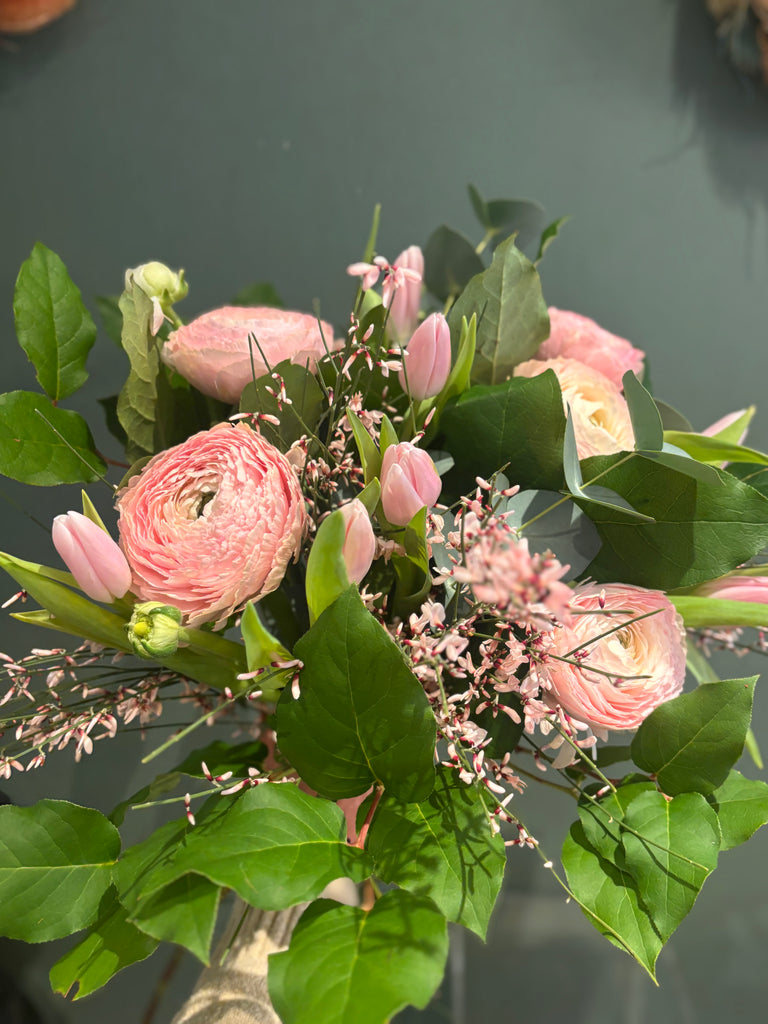 Our best selling spring bouquet features stunning Ranunculus with pink tulips, seasonal foliage all beautifully hand tied in our signature gifting.Shade of tulips will vary.